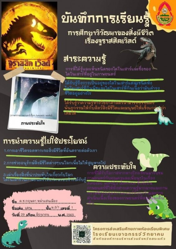 กิจกรรม ชมภาพยนตร์วิทยาศาสตร์เพื่อการเรียนรู้ เรื่องจูราสสิคเวิลด์ วันที่ 29 มิถุนายน 2565 ณ โรงภาพยนตร์ SF ศูนย์การค้าบิ๊กซีซุปเปอร์เซ็นเตอร์จังหวัดสระแก้ว ของนักเรียนห้องเรียนพิเศษระดับชั้นมัธยมศึกษาตอนต้นโรงเรียนเขาฉกรรจ์วิทยาคม ตามโครงการส่งเสริมศั