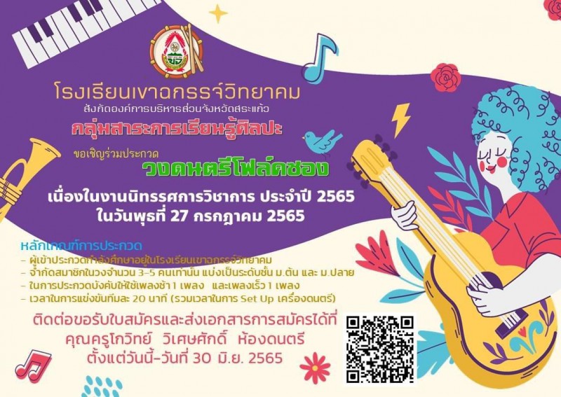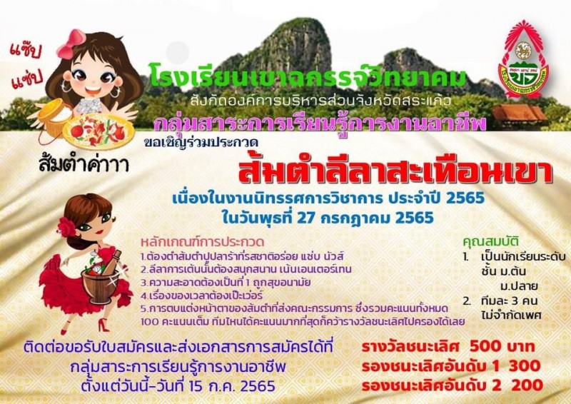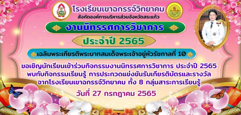 โรงเรียนเขาฉกรรจ์วิทยาคม สังกัดองค์การบริหารส่วนจังหวัดสระแก้ว จัดนิทรรศการวิชาการ ประจำปี 2565 ในวันพุธที่ 27 กรกฎาคม 2565 พบกับกิจกรรมเรียนรู้ การประกวดแข่งขัน รับเกียรติบัตรและรางวัล ทั้ง 8 กลุ่มสาระการเรียนรู้