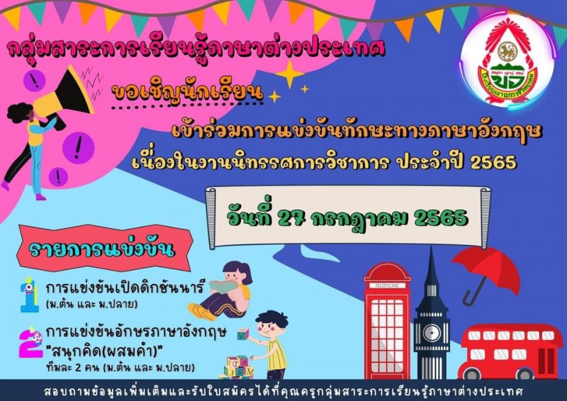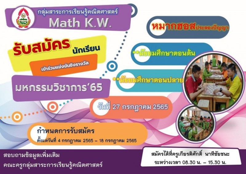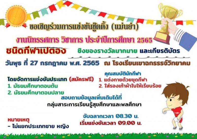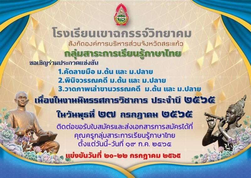 โรงเรียนเขาฉกรรจ์วิทยาคม สังกัดองค์การบริหารส่วนจังหวัดสระแก้ว จัดนิทรรศการวิชาการ ประจำปี 2565 ในวันพุธที่ 27 กรกฎาคม 2565 พบกับกิจกรรมเรียนรู้ การประกวดแข่งขัน รับเกียรติบัตรและรางวัล ทั้ง 8 กลุ่มสาระการเรียนรู้ |