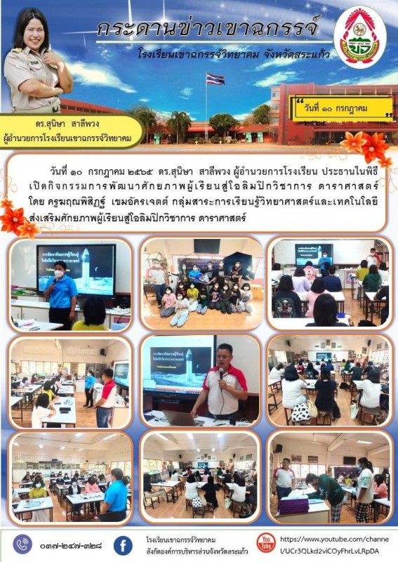 วันที่ 10 กรกฎาคม 2565 ดร.สุนิษา สาลีพวง ผู้อำนวยการโรงเรียน ประธานในพิธีเปิดกิจกรรมการพัฒนาศักยภาพผู้เรียนสู่โอลิมปิกวิชาการ ดาราศาสตร์ โดย ครูฆฤณพิสิฏฐ์ เขมอัครเจตต์ กลุ่มสาระการเรียนรู้วิทยาศาสตร์และเทคโนโลยี ส่งเสริมศักยภาพผู้เรียนสู่โอลิมปิกวิชา
