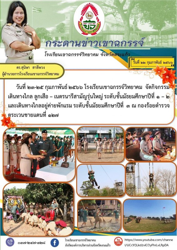 วันที่ 23-25 กุมภาพันธ์ 2566 โรงเรียนเขาฉกรรจ์วิทยาคม จัดกิจกรรมเดินทางไกล ลูกเสือ – เนตรนารีสามัญรุ่นใหญ่ ระดับชั้นมัธยมศึกษาปีที่ 1 – 2 และเดินทางไกลอยู่ค่ายพักแรม ระดับชั้นมัธยมศึกษาปีที่ 3 ณ กองร้อยตำรวจตระเวนชายแดนที่ 127