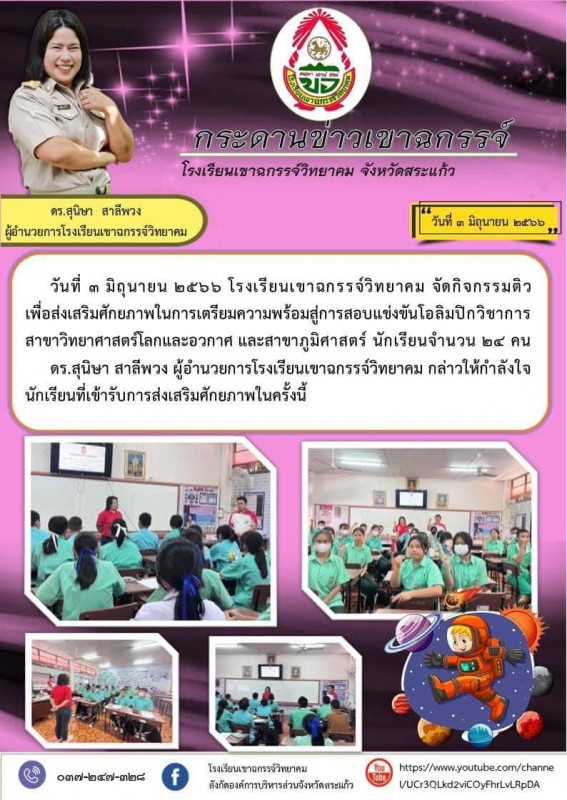 วันที่ 3 มิถุนายน 2566 โรงเรียนเขาฉกรรจ์วิทยาคม จัดกิจกรรมติวเพื่อส่งเสริมศักยภาพในการเตรียมความพร้อมสู่การสอบแข่งขันโอลิมปิกวิชาการสาขาวิทยาศาสตร์โลกและอวกาศ และสาขาภูมิศาสตร์ นักเรียนจำนวน 24 คน ดร.สุนิษา สาลีพวง ผู้อำนวยการโรงเรียนเขาฉกรรจ์วิ