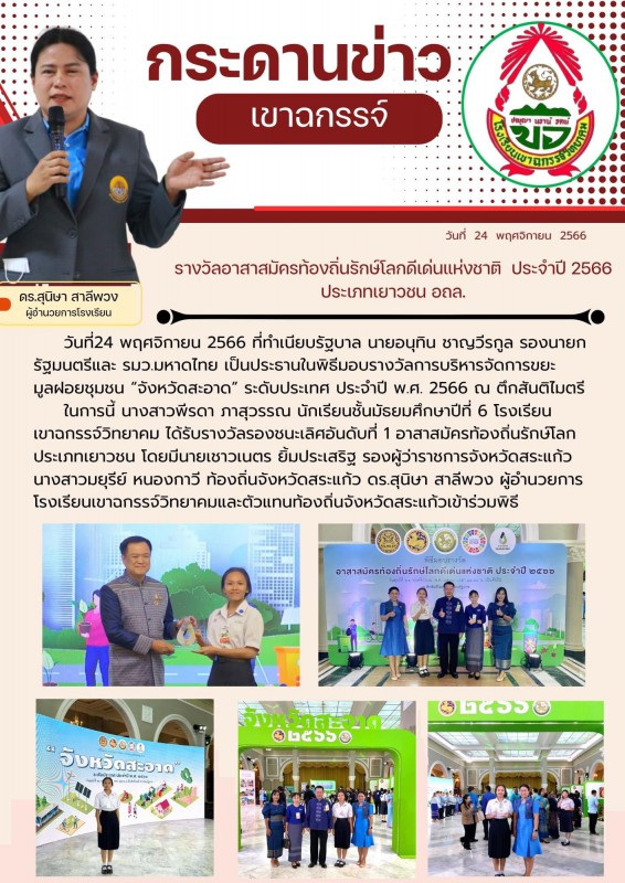 วันที่24 พฤศจิกายน 2566 ที่ทำเนียบรัฐบาล นายอนุทิน ชาญวีรกูล รองนายกรัฐมนตรีและ รมว.มหาดไทย เป็นประธานในพิธีมอบรางวัลการบริหารจัดการขยะมูลฝอยชุมชน “จังหวัดสะอาด” ระดับประเทศ ประจำปี พ.ศ. 2566 ณ ตึกสันติไมตรี ในการนี้ นางสาวพีรดา ภาสุวรรณ นักเรียนชั้น