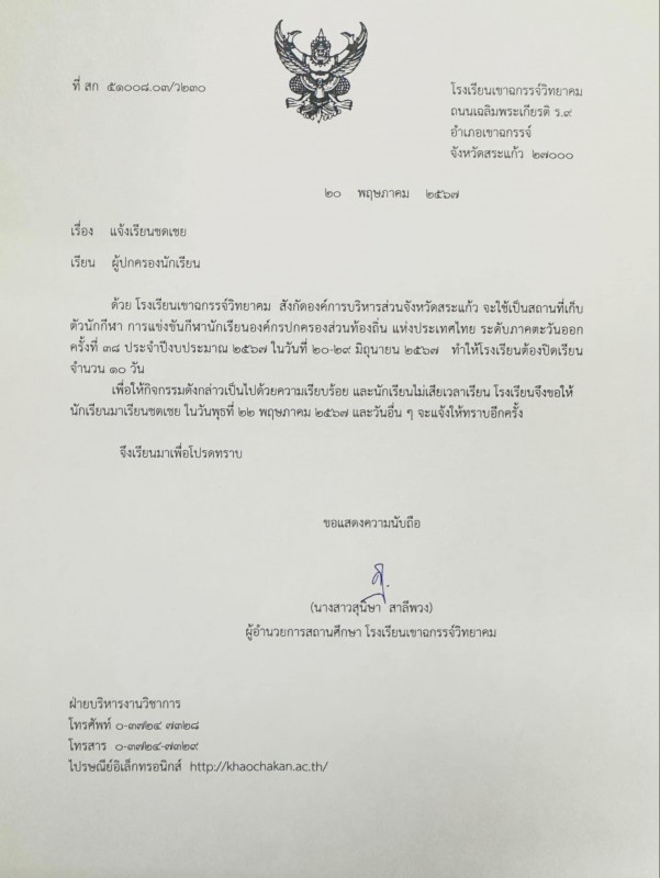 แจ้งเรียนชดเชย ในวันพุธที่ 22 พฤษภาคม 2567
