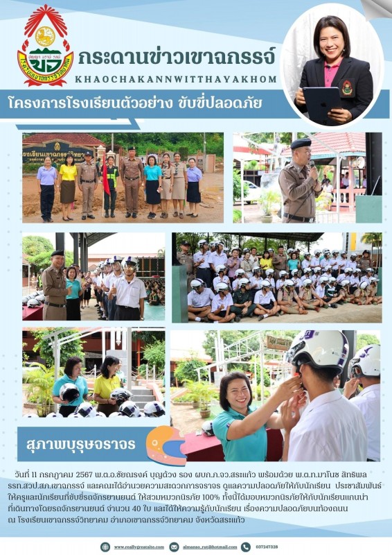 วันที่ 11 กรกฎาคม 2567 พ.ต.อ.ชัยณรงค์ บุญด้วง รอง ผบก.ภ.จว.สระแก้ว พร้อมด้วย พ.ต.ท.มาโนช สิทธิพล รรท.สวป.สภ.เขาฉกรรจ์ และคณะได้อำนวยความสะดวกการจราจร ดูแลความปลอดภัยให้กับนักเรียนประชาสัมพันธ์ให้ครูและนักเรียนที่ขับขี่รถจักรยานยนต์ ให้สวมหมวกนิรภัย 100% ทั้งนี้ได้มอบหมวกนิรภัยให้กับนักเรียนแกนนำที่เดินทางโดยรถจักรยานยนต์ จำนวน 40 ใบ และได้ให้ความรู้กับนักเรียน เรื่องความปลอดภัยบนท้องถนน ณ โรงเรียนเขาฉกรรจ์วิทยาคม อำเภอเขาฉกรรจ์วิทยาคม จังหวัดสระแก้ว