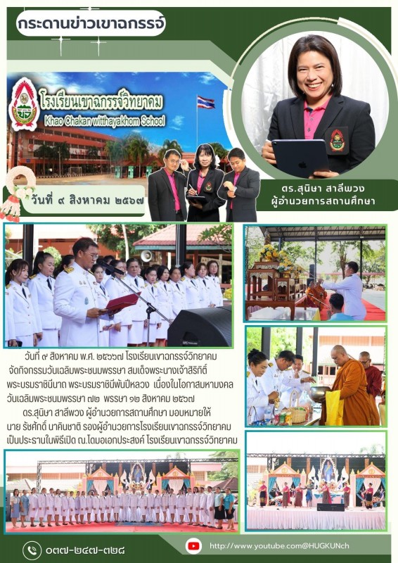 วันที่ ๙ สิงหาคม พ.ศ. ๒๕๖๖๗ โรงเรียนเขาฉกรรจ์วิทยาคม จัดกิจกรรมวันเฉลิมพระชนมพรรษา สมเด็จพระนางเจ้าสิริกิติ์ พระบรมราชินีนาถ พระบรมราชินีพันปีหลวง เนื่องในโอกาสมหามงคล วันเฉลิมพระชนมพรรษา ๗๒ พรรษา ๑๒ สิงหาคม ๒๕๖๗ ดร.สุนิษา สาลีพวง ผู้อำนวยการสถา