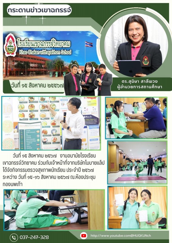 วันที่ ๑๕ สิงหาคม ๒๕๖๗ งานอนามัยโรงเรียนเขาฉกรรจ์วิทยาคม ร่วมกับเจ้าหน้าที่จากบริษัทโมบายแล็ป ได้จัดกิจกรรมตรวจสุขภาพนักเรียนประจำปี ๒๕๖๗ ระหว่าง วันที่ ๑๕-๑๖ สิงหาคม ๒๕๖๗ ณ.ห้องประชุมทองนพเก้า