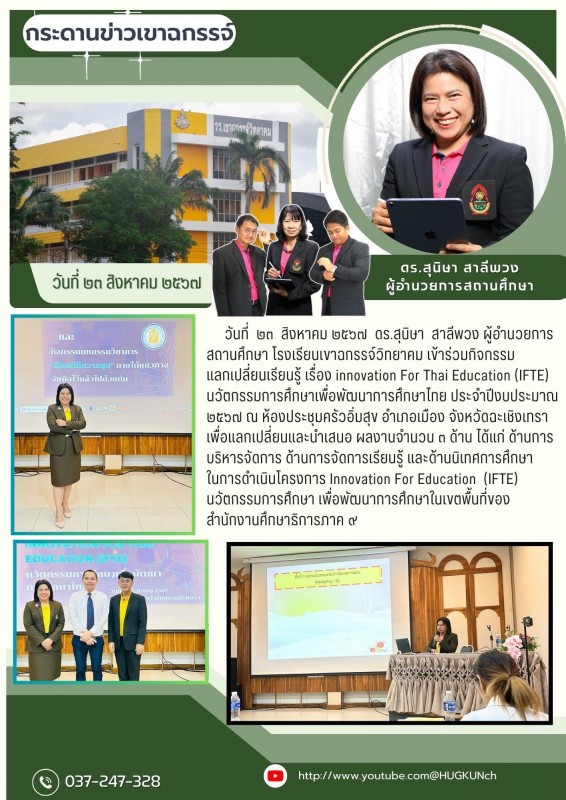 วันที่ ๒๓ สิงหาคม ๒๕๖๗ ดร.สุนิษา สาลีพวง ผู้อำนวยการสถานศึกษา โรงเรียนเขาฉกรรจ์วิทยาคม เข้าร่วมกิจกรรมแลกเปลี่ยนเรียนรู้ เรื่อง innovation For Thai Education (IFTE) นวัตกรรมการศึกษาเพื่อพัฒนาการศึกษาไทย ประจำปีงบประมาณ ๒๕๖๗ ณ ห้องประชุมครัวอิ่มสุข อำเภอเมือง จังหวัดฉะเชิงเทรา เพื่อแลกเปลี่ยนและนำเสนอ ผลงานจำนวน ๓ ด้าน ได้แก่ ด้านการบริหารจัดการ ด้านการจัดการเรียนรู้ และด้านนิเทศการศึกษา