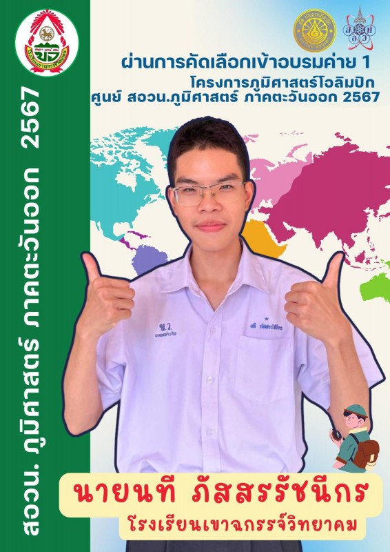 #คนเก่ง ขว. ขอแสดงความยินดีกับ นายนที ภัสสรรัชนีกร นักเรียนชั้นมัธยมศึกษาปีที่ 4 ผ่านการสอบคัดเลือกเข้าอบรมค่าย 1 โครงการภูมิศาสตร์โอลิมปิก ศูนย์ สอวน.ภูมิศาสตร์ ภาคตะวันออก ประจำปีการศึกษา 2567 ทั้งนี้ ขอขอบพระคุณ นายฐานิสร์ เทียนทอง นายกอ