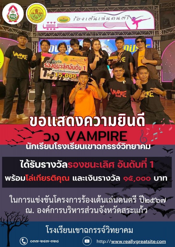 ขอแสดงความยินดีกับนักดนตรีวง Vampire นักเรียนโรงเรียนเขาฉกรรจ์วิทยาคม เข้าร่วมแข่งขันโครงการร้องเต้นเล่นดนตรี ได้รับรางวัลรองชนะเลิศอันดับ ที่ ๑ พร้อมโล่เกียรติคุณ และเงินรางวัล ๑๕๐๐๐ บาท ณ หอประชุมองค์การบริหารส่วนจังหวัดสระแก้ว เพื่อส่งเสริม ส่งเสริมให้