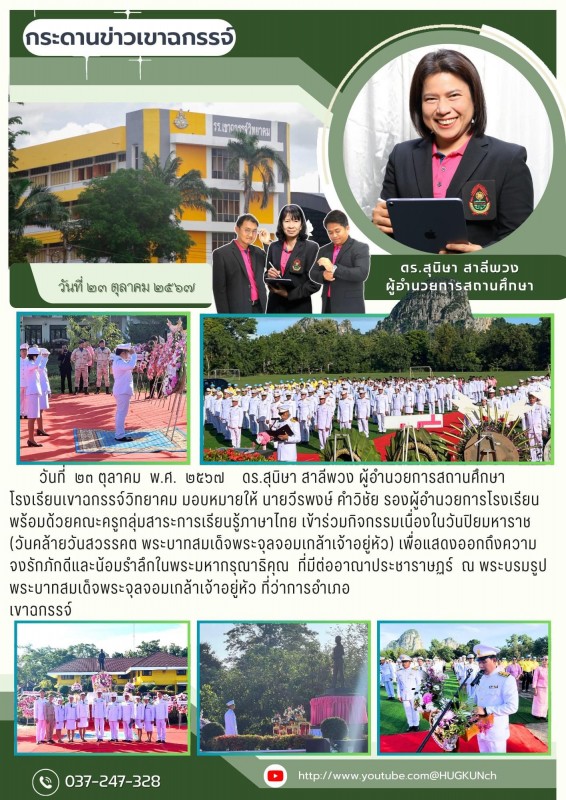 วันที่ ๒๓ ตุลาคม พ.ศ. ๒๕๖๗ ดร.สุนิษา สาลีพวง ผู้อำนวยการสถานศึกษาโรงเรียนเขาฉกรรจ์วิทยาคม มอบหมายให้ นายวีรพงษ์ คำวิชัย รองผู้อำนวยการโรงเรียน พร้อมด้วยคณะครูกลุ่มสาระการเรียนรู้ภาษาไทย เข้าร่วมกิจกรรมเนื่องในวันปิยมหาราช (วันคล้ายวันสวรรคต พระบาทสม