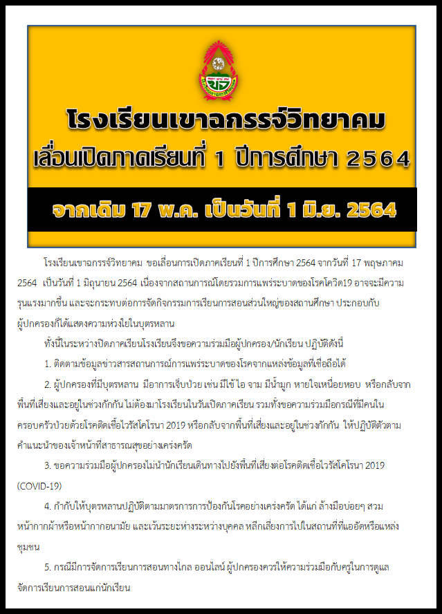 ประกาศการเลื่อนการเปิดภาคเรียนปีการศึกษา 1/ 2564