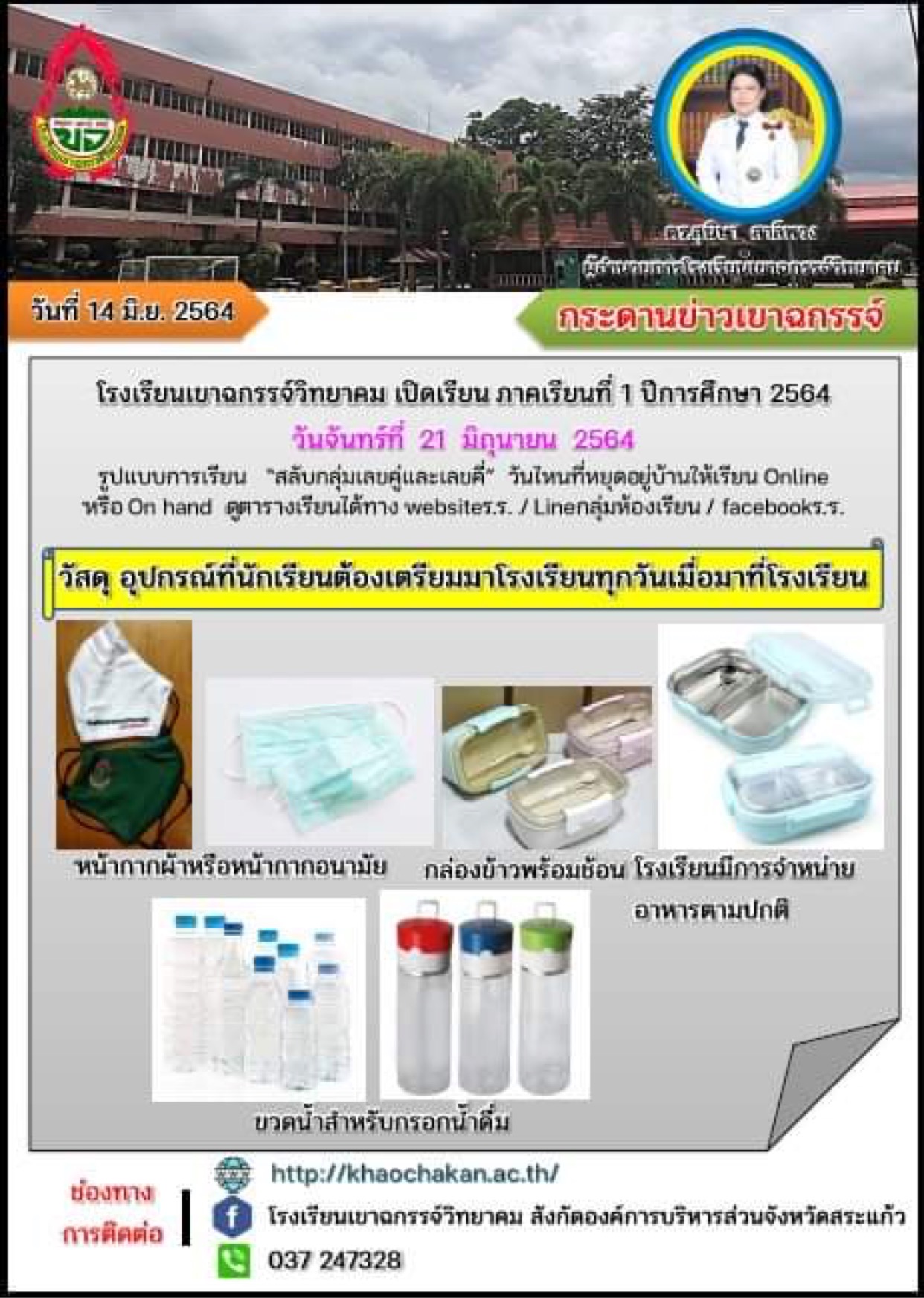 ประชาสัมพันธ์การเปิดภาคเรียน 1/2564 ในวันจันทร์ที่ 21 มิถุนายน 2564 รูปแบบการเรียน สลับกลุ่มเลขคู่และเลขคี่
